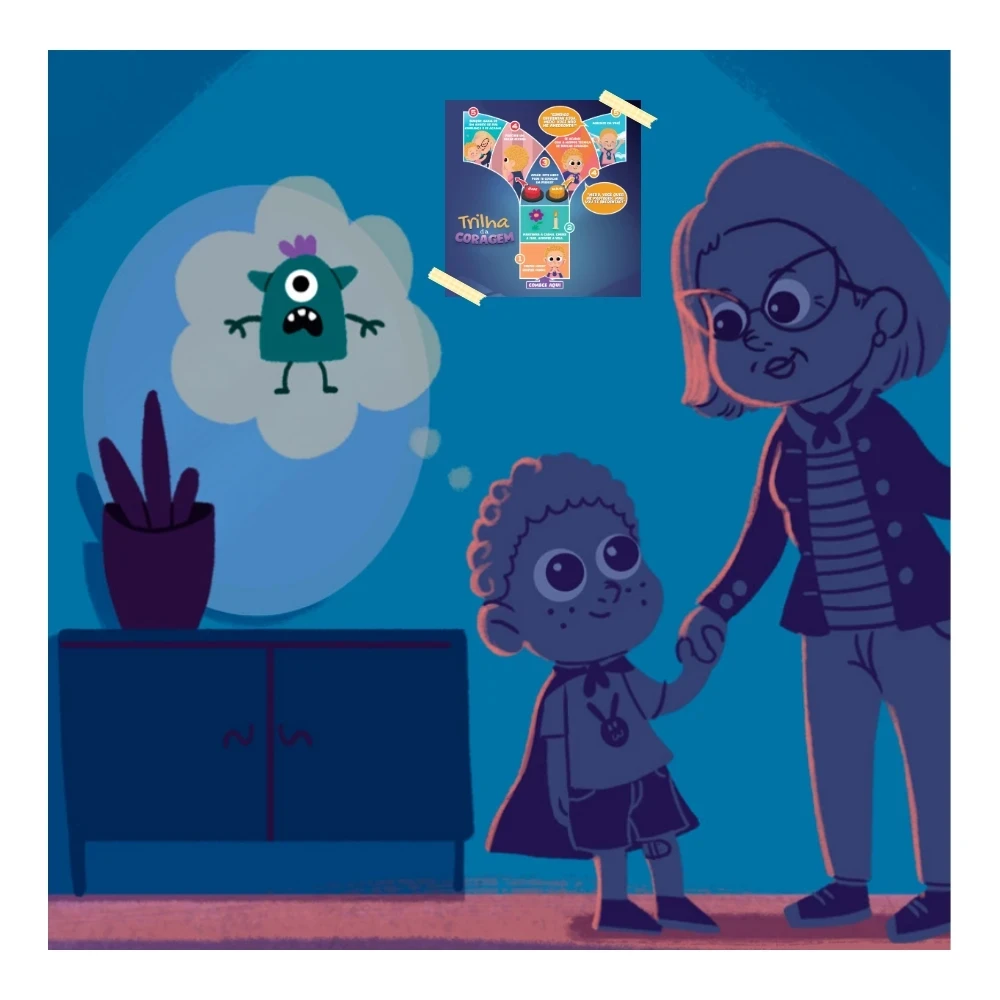 Cartão de 21x21 cm com desenho da Trilha da Coragem, para explicar e conversar com a criança sobre medo e coragem. Livro não incluso.