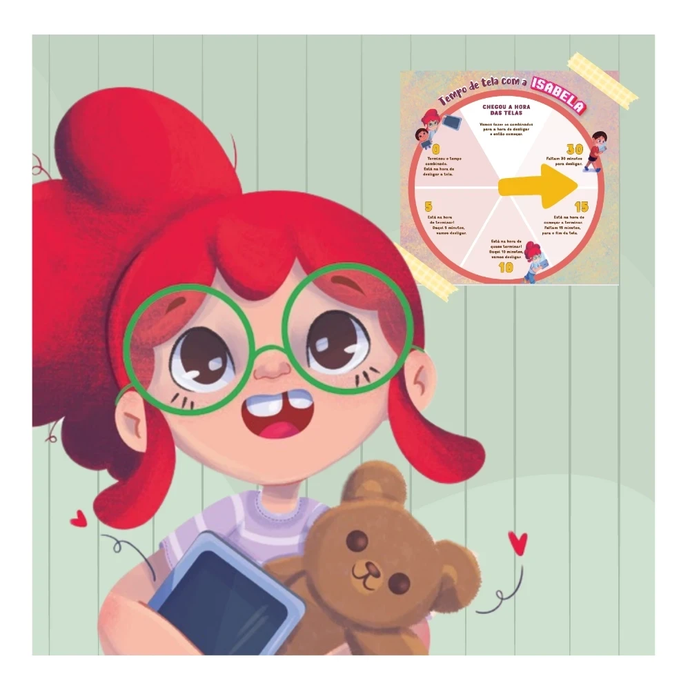 Cartão de 21x21cm com tempo combinado de uso de tela, para explicar e conversar com a criança sobre como é importante respeitar o acordado e desligar a tela quando o tempo chegar ao fim.